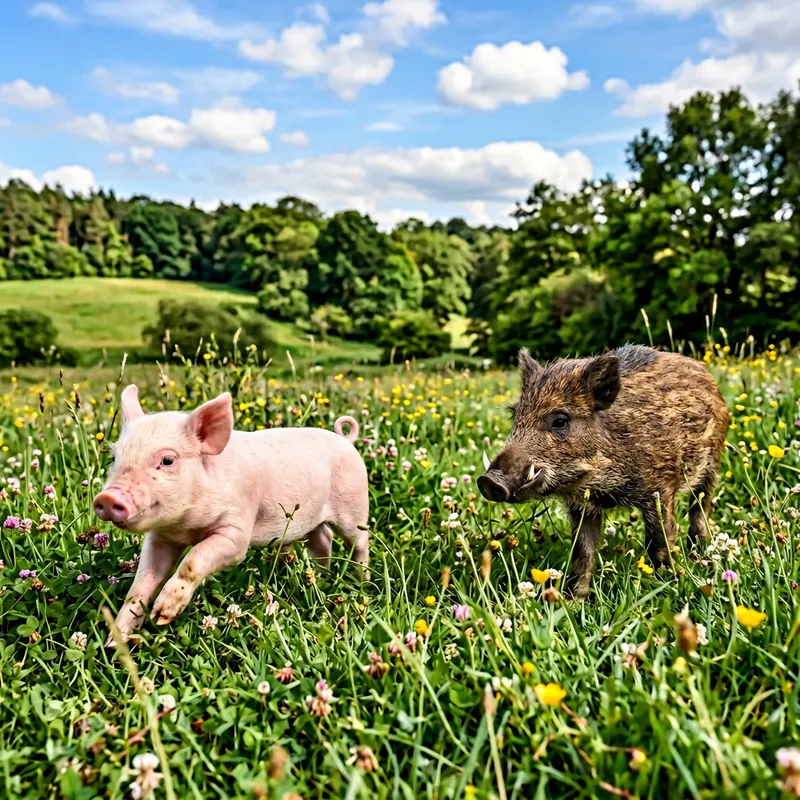 A little pink piglet is joyfully playing in a lush green field under a bright blue sky. The piglet's body is rounded, its ears are small and perky, and its snout is flat with two tiny nostrils. Its tail is small and neatly coiled. A few feet away from the piglet, there's a wild boar piglet. It is larger than the pink piglet with a brownish-black coat, longer snout, small piercing eyes and sharp tusks protruding from its mouth. It's curiously observing the pink piglet and trying to join its playful antics.