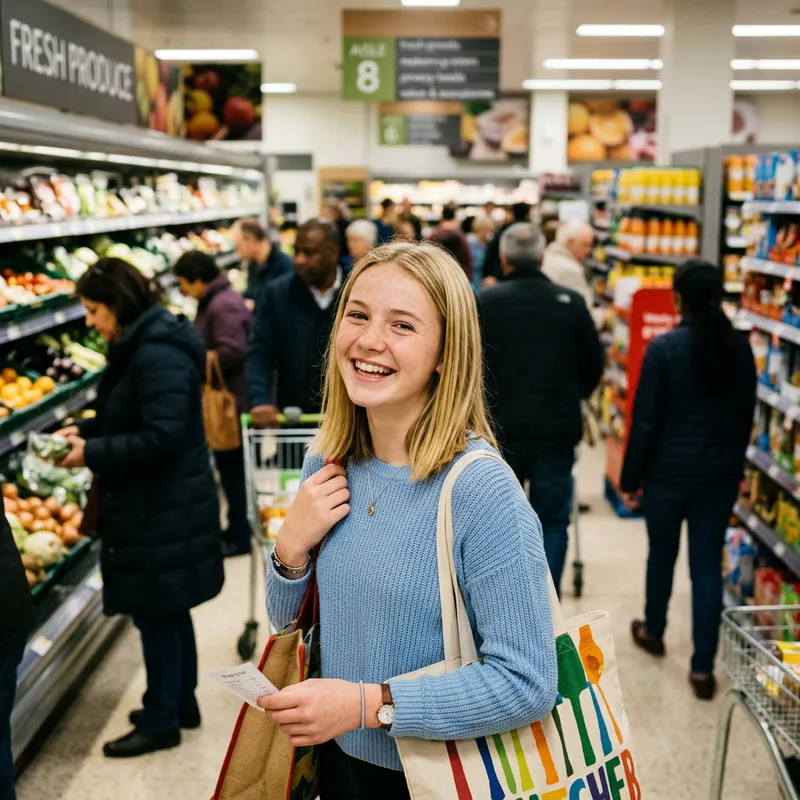 A waist-up depiction of a joyful, attractive teenage girl of Caucasian descent with medium-length straight blonde hair and some freckles. She is seen standing in a bustling supermarket with other shoppers of varying descents and genders in the background, slightly blurred to bring the focus to the girl.