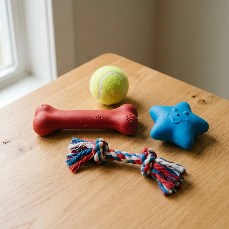 A minimalistic, artful representation of a vibrant display of various dog toys. The composition includes a rubber bone, a tennis ball, a squishy squeaker toy, and a rope. They are arranged in a balanced layout on a clean surface, bathed in soft, ambient light. The emphasis is on simplicity, abstract shapes, and bold colors typical for dog toys like red, blue, and yellow. The essence of the scene conveys the simple joy that these objects bring to our canine friends