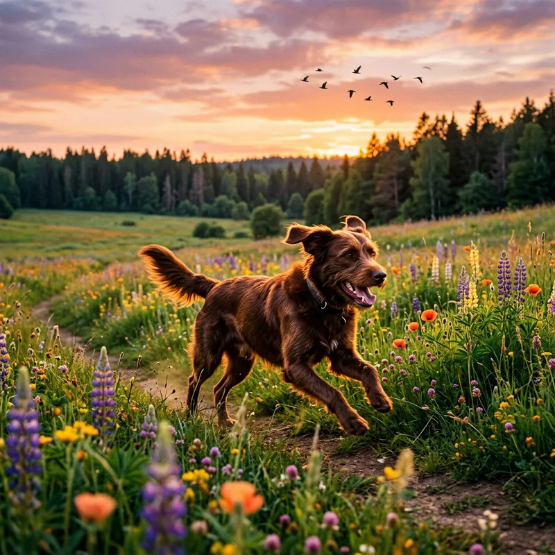 A playful dog of no specific breed, with a glossy brown fur, running joyously on a grassy plain during the golden hours of sunset. The landscape around the dog is rich with wildflowers of various colors, and in the distance, thick woods can be seen. The sky above is a mixture of pastel orange and purple colors, indicating dusk. A few birds are silhouetted against the sky, just heading home.