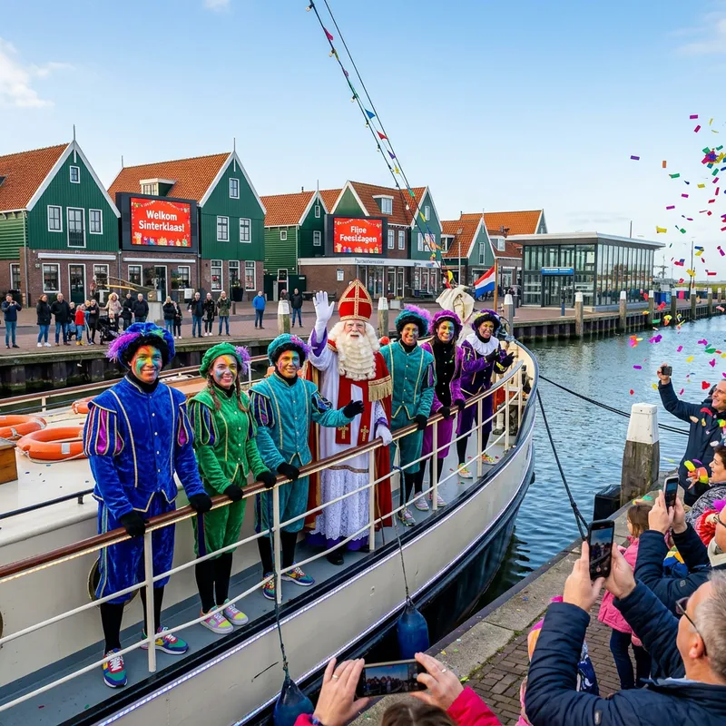 In the Dutch city of Volendam, during the day, stands a ship, on which Sinterklaas is joyously present. Accompanying him are both male and female assistants, known as 'Petes'. They wear traditional costumes associated with their roles but with a contemporary touch. Their faces are painted in vibrant rainbow colors, hinting at a celebration of diversity and inclusion. The scenery is not historical, but rather reflects the digital era with modern aesthetic elements and technology being visible. The atmosphere is festive, the colors are bold and the mood is jovial.