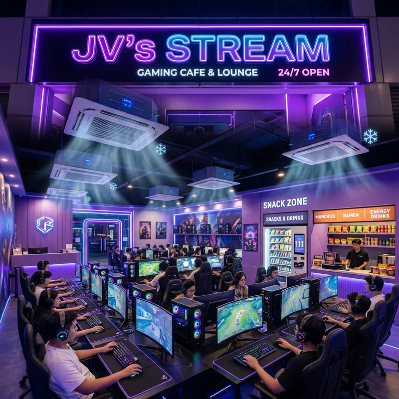 Create a spacious internet cafe with a violet background, ideally suited for gamers. The inside should have around 20 computers equipped with mouses and headphones, and the outside design should also be visually appealing. The cafe should be called 'JV's STREAM.' Visualize five air conditioners situated at the top, taking care to demonstrate their superior cooling abilities. Besides the hi-tech amenities, there should also be a food stall or vending machine to cater to the gamers' munchies. The design should manage to strike a balance between functionality and creative style.