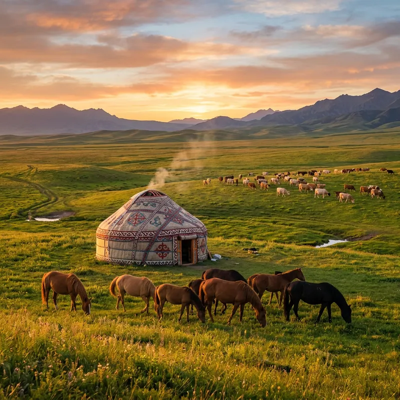 Discover the Kazakh Yurt in the Steppe with Grazing Horses