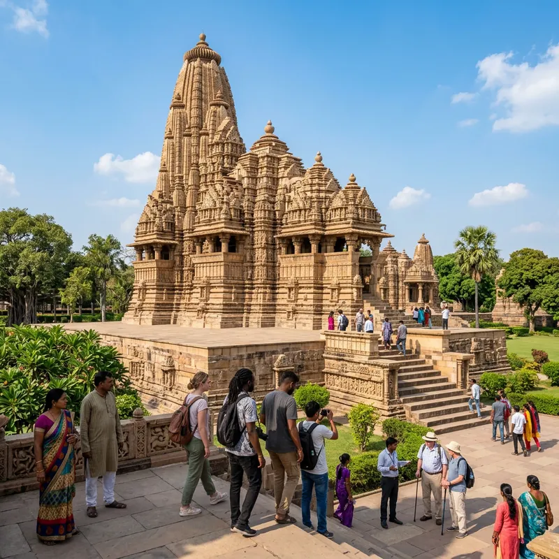 A detailed view of the ancient Khajuraho Temple. The grandeur of this heritage site is highlighted with intricate stone carvings and statues adorning its exterior. The temple is surrounded by lush greenery and clear blue skies overhead. People of diverse descents and genders are seen exploring the temple grounds, immersing themselves in the rich history.