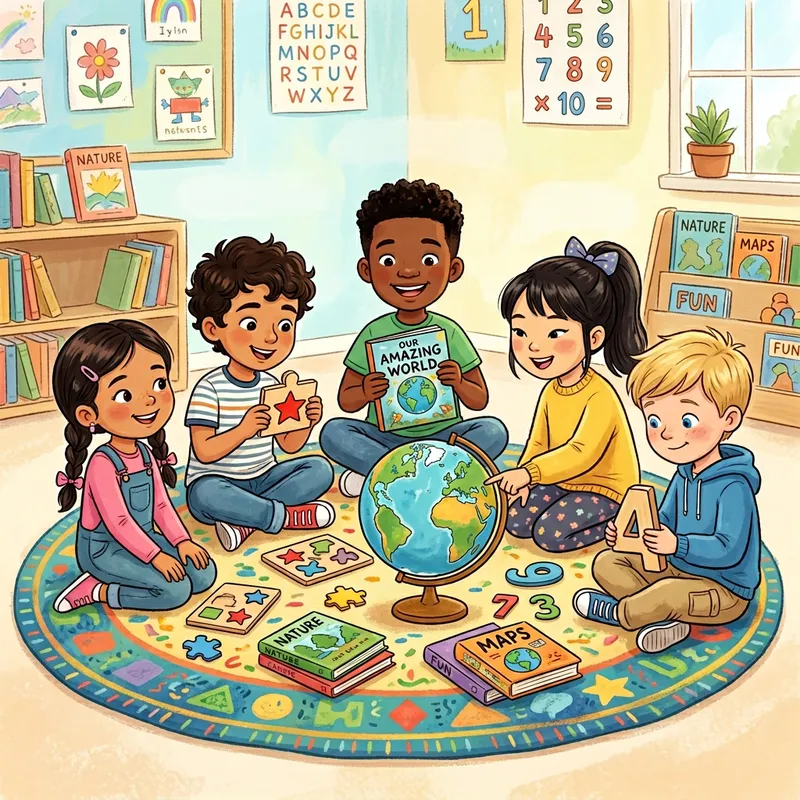 An illustration of a diverse group of children who are learning together. They are all sitting in a semi-circle on a brightly coloured, round rug. Their ages range from 5 to 10 years old. In the centre of the circle is a globe, along with some illustrated books, puzzle pieces and numbers. Among the children are a Hispanic girl with pigtails, a Black boy with a short afro who's holding up a book, an East Asian girl with a ponytail looking at the globe, a Middle-Eastern boy with curly hair holding a puzzle piece, and a Caucasian boy with blond hair examining a number. They are all wearing casual, comfortable clothes. Make the illustration bright and colourful, with a soft, pastel background.