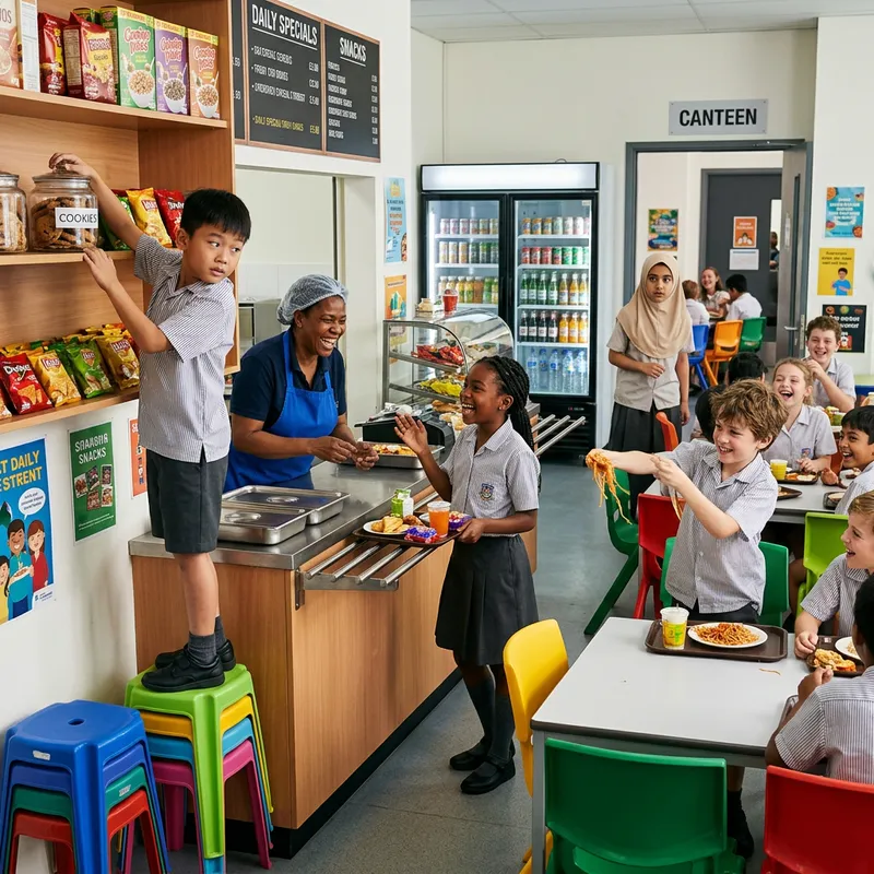 A diverse group of children engaging in a playful adventure at a school canteen. The scene features an Asian boy sneakily reaching for a cookie jar on a high shelf, a Black girl cheerfully distracting the canteen lady, a Caucasian boy cleverly starting a food fight as a distraction and a Middle-Eastern girl cautiously acting as a lookout. The environment is filled with laughter, high energy, and typical school canteen elements such as trays of food, snack packets, brightly colored stools and large refrigerators.