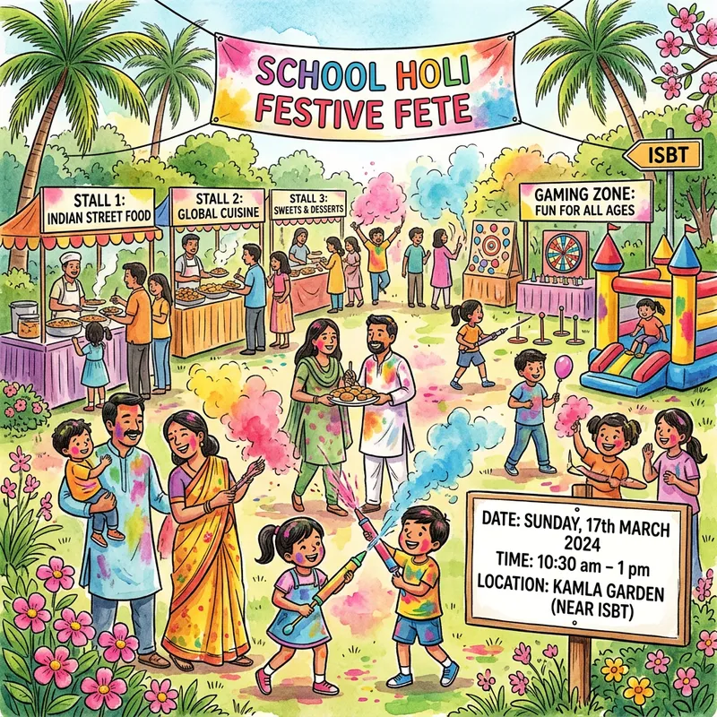 Design an artwork for a festive event at a school. The setting is an energetic school fete, taking place on the occasion of the colorful festival Holi. The fete encompasses an array of food stalls showcasing a variety of cuisine, as well as a vibrant gaming zone, promising a joyful family time. This event is scheduled for the date, 17th March 2024, which falls on a Sunday. The time of the event is between 10:30 am and 1 pm. The lush location to host this gala event is a picturesque garden named 'Kamla Garden', situated nearby a prominent location, ISBT.