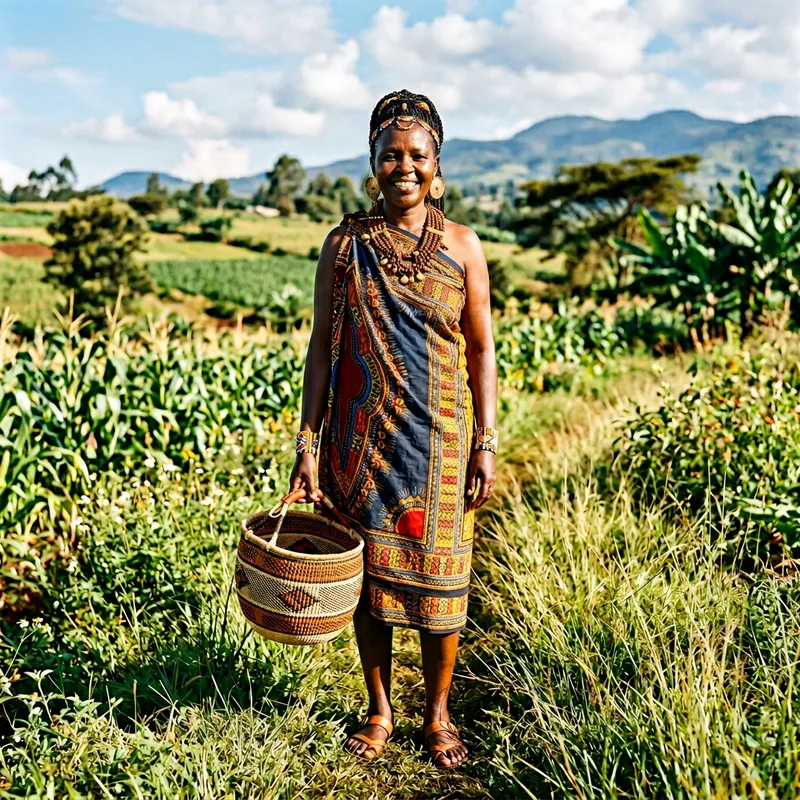A Kikuyu woman from Kenya, standing tall and proud in a sunlit field. She is elegantly dressed in traditional Kikuyu attire, vibrant colors adorning her outfit. A colorful beaded necklace hangs delicately around her neck, resting on her beautiful red and yellow patterned clothing. Her eyes shine with wisdom and her smile displays a deep sense of pride and respect towards her cultural heritage. She holds in her hand an intricately woven basket, a testament to the exquisite craftsmanship renowned in Kikuyu culture.