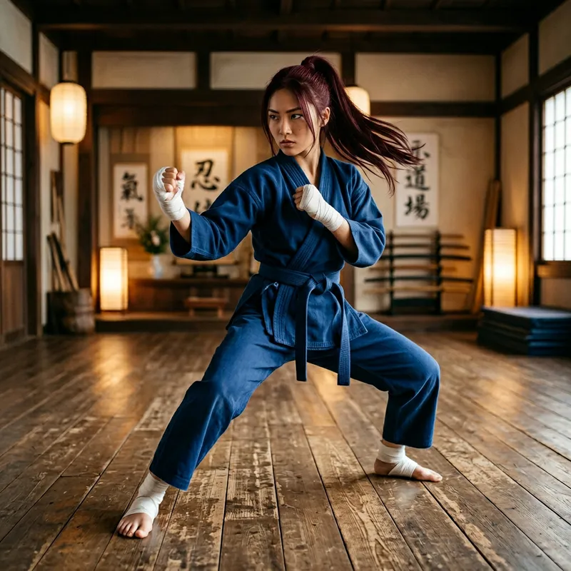 A fictional character named Kita Ikuyo, depicted as a young adult woman of Asian descent with long black hair styled into a high ponytail. She is positioned in a dynamic martial arts posturing, and her expression reflects determination and focus. She is wearing traditional martial arts attire in a deep shade of blue, complete with white bandages wrapped around her hands and feet. A softly illuminated dojo with wood detailing forms the background, creating an ambiance of serene intensity.