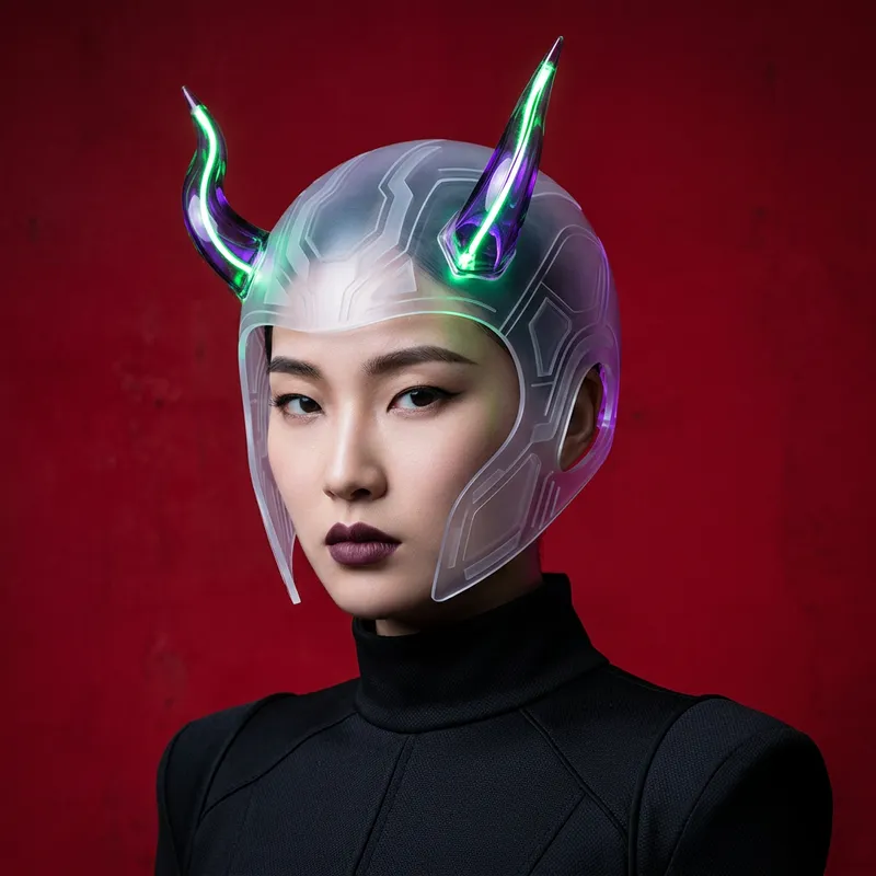 korean girl with fair skin, wearing a translucent and transparent headgear that covers her entire head, creating a surreal, futuristic effect. The headgear is delicate, yet striking, with subtle geometric patterns etched into its surface. Attached to the headgear are glowing, toxic-colored horns that twist upward in sharp, angular shapes, emitting a faint green and purple glow. Beneath the translucent surface, further enhancing the otherworldly, fierce look. The background is red to create an visual art of the highest artistic influence, allowing the glowing elements to stand out, creating a haunting, high-fashion, sci-fi aesthetic.