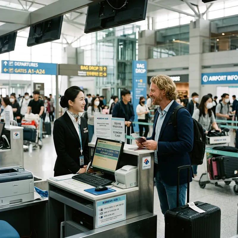 A South Korean flight attendant dressed in a sleek black uniform is engaged in conversation with a Caucasian male customer who is characterized by his blonde hair. They are both situated at the check-in counter within an airport setting, surrounded by the usual hustle and bustle of passengers and luggage.