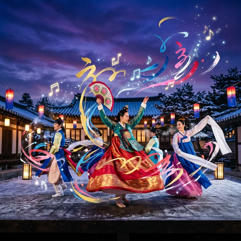 A visual interpretation of a Korean traditional dance taking place on a cold, frosty evening. The dancers are dressed in vibrant hanbok costumes, which traditionally consist of a jeogori (jacket), baji (pants for men), and chima (skirt for women). Capturing the essence of the performance, their movements are being translated into abstract brush strokes that seem to dance along with them, reflecting the rhythm of the dance, just like the music notes floating in the air. The background is streaked with various shades of purple and blue, reminiscent of the twilight sky, providing a striking contrast with the colorful costumes and the lively atmosphere of the dance.