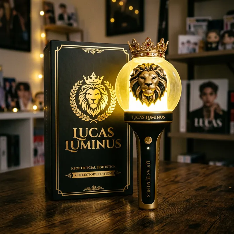 An image of a Kpop lightstick placed in front of its packaging box. The lightstick is designed in black and gold colors, with a glow of yellow light radiating from it. On top of the lightstick is a charming depiction of a lion's head wearing a regal crown. At the back is a box, serving as the lightstick's backdrop, and features a logo text that reads 'LUCAS LUMINUS'.