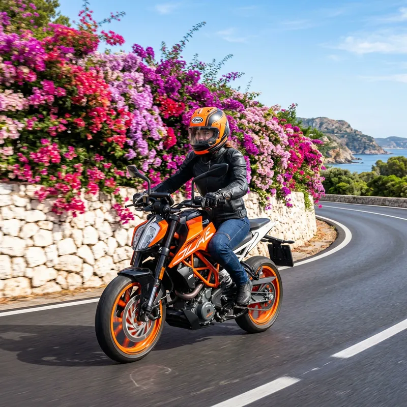 A bright orange KTM Duke 390 motorbike traveling on a smooth, shiny asphalt road, the sunlight reflecting off of its sleek surface. The bike's rider, a Caucasian woman dressed in a fitted black leather jacket, denim jeans, and a matching orange helmet sits confidently astride the vehicle. She seems to ride effortlessly, showing great mastery. The background is a riot of color, with large Bougainvillea bushes in full bloom, their vibrant pink and magenta flowers cascading over a white stone wall bordering the street, creating a striking contrast against the clear blue sky. The scene is not only vibrant and filled with motion but also incredibly picturesque.