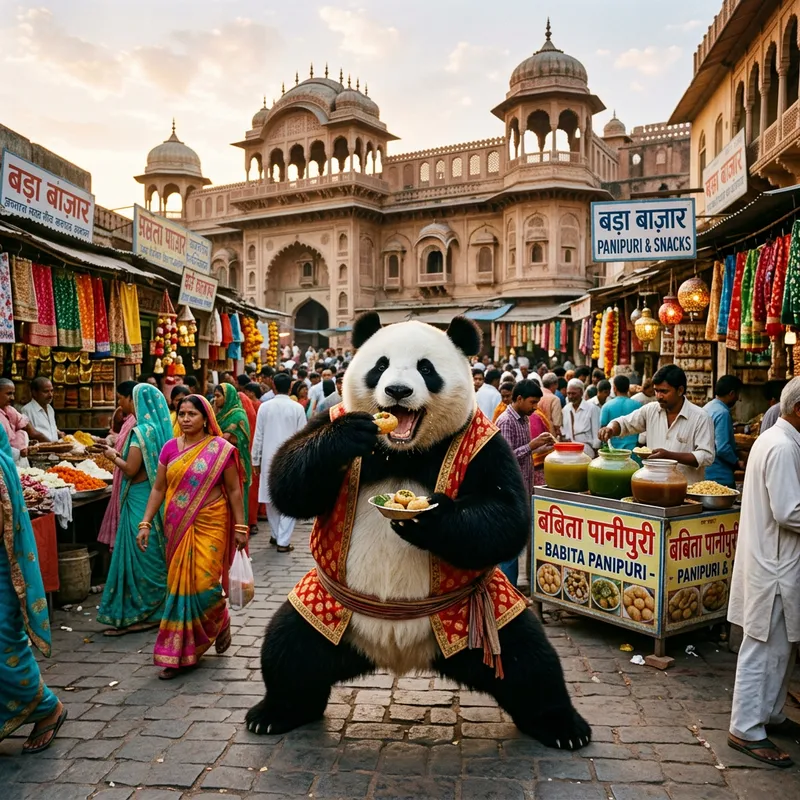 A large and lovable black and white panda engaged in a martial arts stance. He is in a traditional Indian marketplace teeming with people and vibrant colours. The panda is joyously devouring panipuri, a popular Indian snack consisting of hollow puri, stuffed with spicy tangy water, tamarind chutney, chili, chaat masala, boiled potatoes, and onions. The backdrop is majestic with the recognisable architecture of Indian palaces peeping through.
