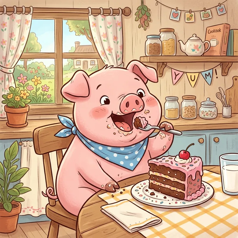 Original Prompt: la vignetta di un maialino che mangia una fetta di torta