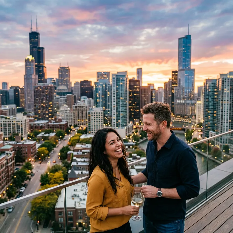 A cityscape serves as a captivating backdrop while two individuals, a Caucasian man and a Hispanic woman are up front, their faces lighting up in laughter. They are standing side by side, sharing a humorous moment. The city is a blend of modern and traditional architecture with high rise buildings, trees speckling the scene, and the sky above painted with hues of the setting sun. The warmth of their interaction contrasts beautifully with the urban setting.