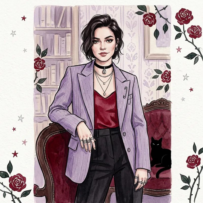 Generate an artistic portrayal of a person as per the given characteristics. The style is reminiscent of old money with a hint of soft punk aesthetics. The color scheme revolves around lavender and cherry red shades. Scatter around minimalistic visual booties like roses, cats, and stars to enhance the portrait. The person is dressed appropriately in punk-inspired fashion. Their attire and facial expression - assertive, but not aggressive - suggests rebellion and affluence combined.
