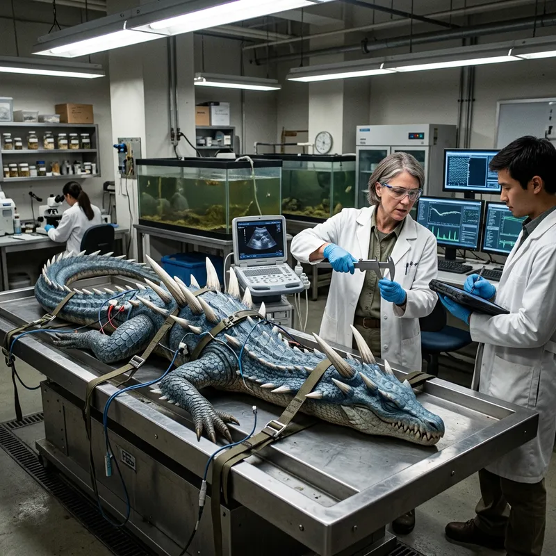 The Lagiacrus from Monster Hunter on an operating table being studied by a scientist.