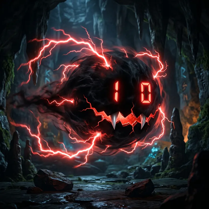 The Pokémon is a ghostly black sphere. The Pokémon is oriented to the left. The Pokémon has no eyes, there are red digital numbers, a 0 on the right and a 1 on the left. Its mouth resembles a large crack running through its body, with 2 vampire fangs. Its body produces red lightning arcs that exit and re-enter its body at another point.