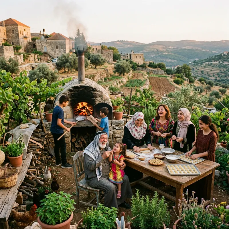In the rolling hillside of a historic Levantine village, a Middle-Eastern family of eight—consisting of the elderly grandparents, mother, two teenage girls, a younger boy, a teenage boy, and a small girl—are engaged in merrymaking as they excitedly prepare desserts for the New Year in their outdoor kitchen garden. Their backyard kitchen includes a chimney-equipped wood-fired oven and a dessert-preparation table. The lively grandfather sits on a wooden chair, playfully interacting with the little girl. Meanwhile, the grandmother, mother, and the eldest teenage girl are involved in crafting delectable sweet treats. The teenage boy and his young brother are nurturing a fire in the oven for baking. Their laughter and joyful discussions blend beautifully with the natural sounds of the environment, creating an exhilarating atmosphere. The scene is further enriched by the local Mediterranean flora and fauna, enhancing the overall festive and jubilant mood.