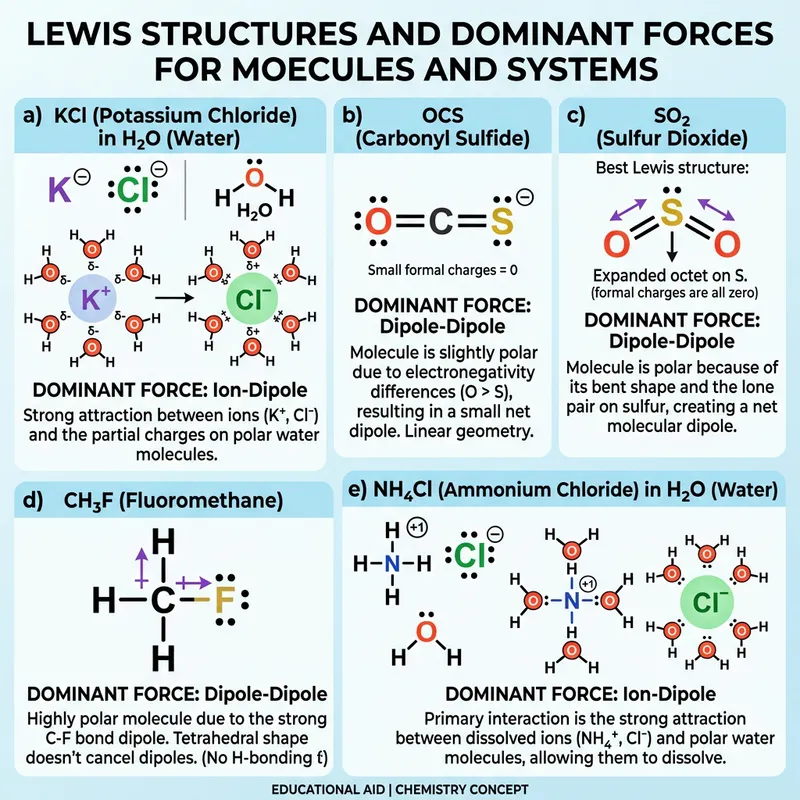 Draw the Lewis structure of the following molecules and predict which force will be dominant: a) KCl (Potassium Chloride) in H2O (Water), b) OCS (Carbonyl Sulfide), c) SO2 (Sulfur Dioxide), d) CH3F (Fluoromethane), and e) NH4Cl (Ammonium Chloride) in H2O (Water).