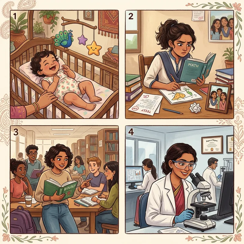 Illustrate the life journey of a young South Asian girl. The journey begins with her as a joyful baby playing with toys in her cradle. Then, display her as a teenager, facing academic challenges and experiencing the highs and lows of adolescence. Show her in college, studying hard and achieving her goals. Finally, depict her as a mature woman, successful in her career as a scientist, showing the ups and downs of her life journey.