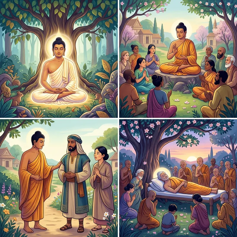 An illustrative series depicting key moments from the life story of the spiritual leader commonly known as Buddha. The first scene pictures a visibly enlightened man, of South Asian descent, meditating beneath a Bodhi tree, his body emanating a soft, ethereal glow. The next scene unfolds to show the man sharing his teachings with a diverse group of people, men and women of different races and ages listening attentively. Another scene captures the spiritual leader encouraging a Middle Eastern man and an East Asian woman to lead a righteous life. The depiction culminates with a serene scene of the leader nearing the end of his physical life, now an old man, surrounded by his devoted followers. The illustration should use a vibrant color palette to radiate a sense of tranquility and wisdom.