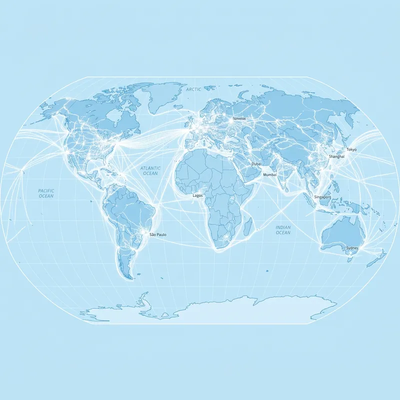 Create a light blue flat world map with an overlay of white infrastructure