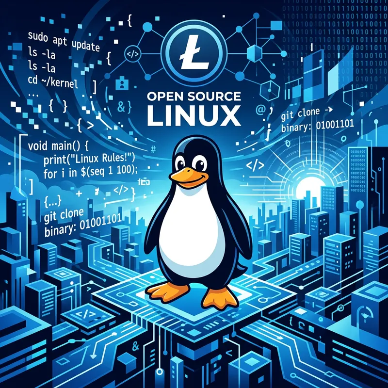 An image depicting the concept of Linux in the style of vector art. The main focus of this image is the penguin mascot, Tux, who represents Linux. He stands in a relaxed posture on an abstract digital landscape, representing the world of open-source software development. Surrounding Tux, there should be floating pixels and lines of code, symbolizing the technical nature of Linux. The color palette features shades of blue, white, and black.
