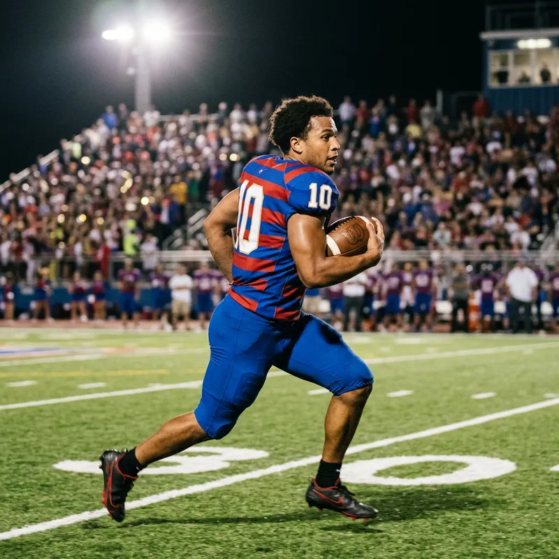 A professional football player driving the ball down the field with a focused look on his face, showing off his short dark hair and his characteristic physique. He wears a blue and red striped uniform with his number 10 visible on the back. The stadium lights illuminate him as the crowd roars in background.