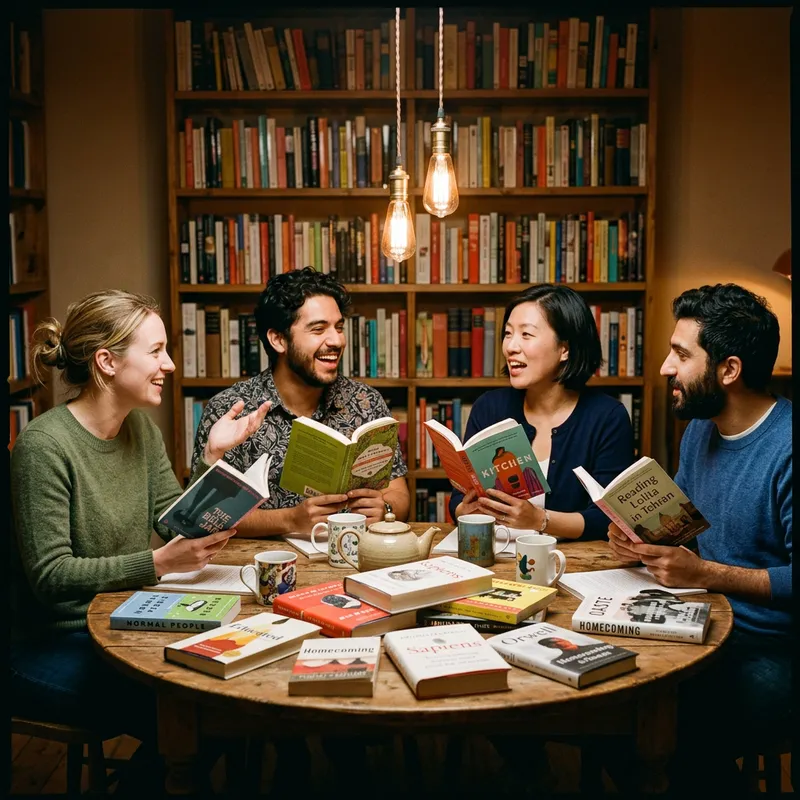 An inviting scene of a diverse literature club. In the center of the image is a round wooden table scattered with myriad books. Four people are engaged in vibrant conversation, each from a different descent - a Caucasian female, a Hispanic male, an Asian female, and a Middle-Eastern male. They're each holding a different book, creating a striking blend of colors added by the variety in book covers. The room is dimly lit, illuminated only by the warm glow of a few lamps hanging overhead. The far wall is adorned with a large bookshelf overflowing with books, a testament to their shared passion for literature.