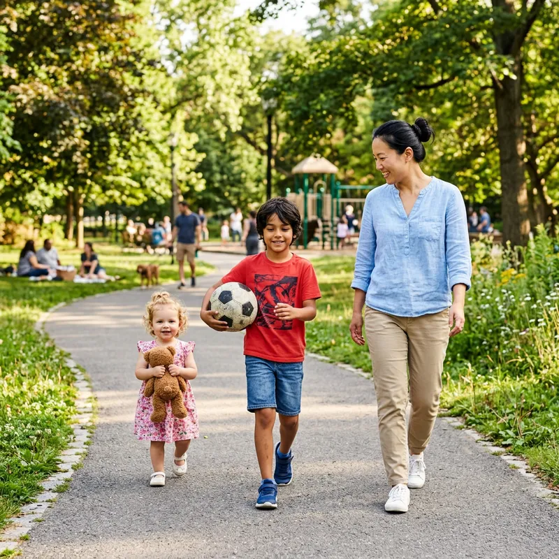 An Asian mother in her mid 30s with black hair tied up in a bun, wearing a light blue blouse and khaki pants, is walking in a sunny park. Beside her is her 9-year-old son of Hispanic descent, wearing a red T-shirt and denim shorts, carrying a soccer ball under his arm. Following them is her 2-year-old Caucasian daughter with blonde curly hair, wearing a pink dress and holding a teddy bear. The scene is lively and full of warmth, demonstrating a loving family spending quality time together.