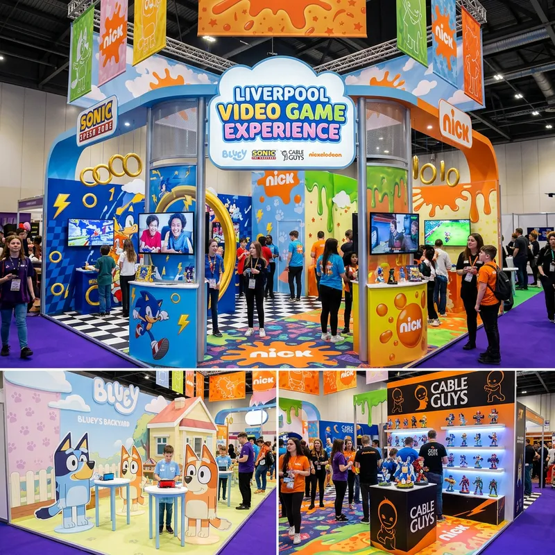Render an exhibition stand for a video game experience in Liverpool with incorporated elements pertaining to cartoons. The stand design should incorporate symbols and emblems that are relevant to Bluey - a renowned animated puppy character, Cable Guys - a popular video game accessories brand, and Sonic - a well-known video game character. These distinct elements should be harmoniously integrated into the general stand design. Additionally, there should be patterns or motifs referencing Nickelodeon - the iconic children's television network. The color scheme of the stand should be vibrant and playful, to attract the young demographic typically associated with these brands.