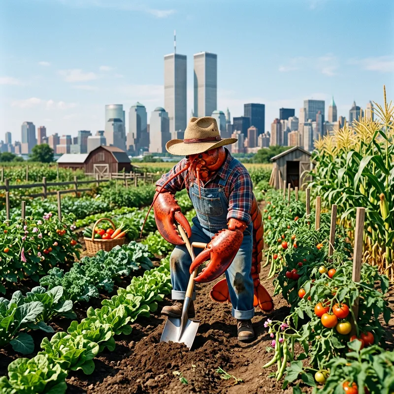 A lobster, anthropomorphic and standing upright, donned in quintessential farm attire including overalls and a wide-brimmed straw hat. This industrious crustacean is busily tending a lush vegetable garden, demonstrating its skill with a shiny, rustic shovel. Planted rows of leafy greens, vibrant tomatoes, and golden cornstalks spread around. Behind this picturesque rural scene rise city's iconic buildings known as the twin towers under a sun-soaked cloudless sky. The contrast between the bustling city infrastructure and the pastoral tranquility evokes a unique amalgamation of nature and urbanity.