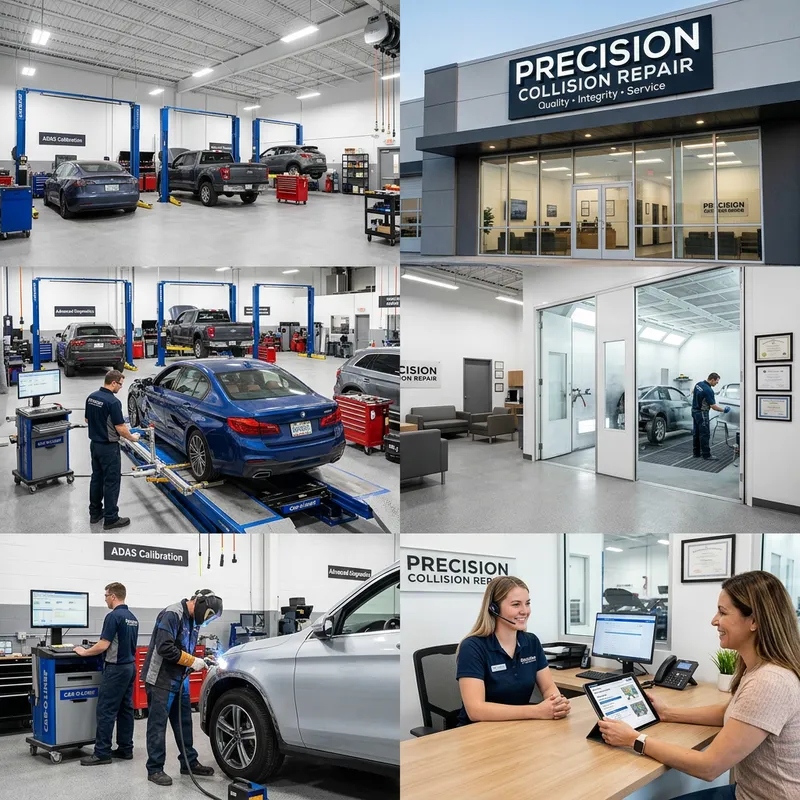 Create an image of a modern, well-equipped auto body shop named 'Precision Collision Repair'. This shop stands out with their superior service, which includes expert mechanics meticulously working on different vehicles. The mechanics use advanced technology and tools for their jobs. Also, depict a scene of their exceptional customer care, with a friendly and professional receptionist assisting a client, explaining the intricate details of the repair process. The shop should project an aura of competency and professionalism.