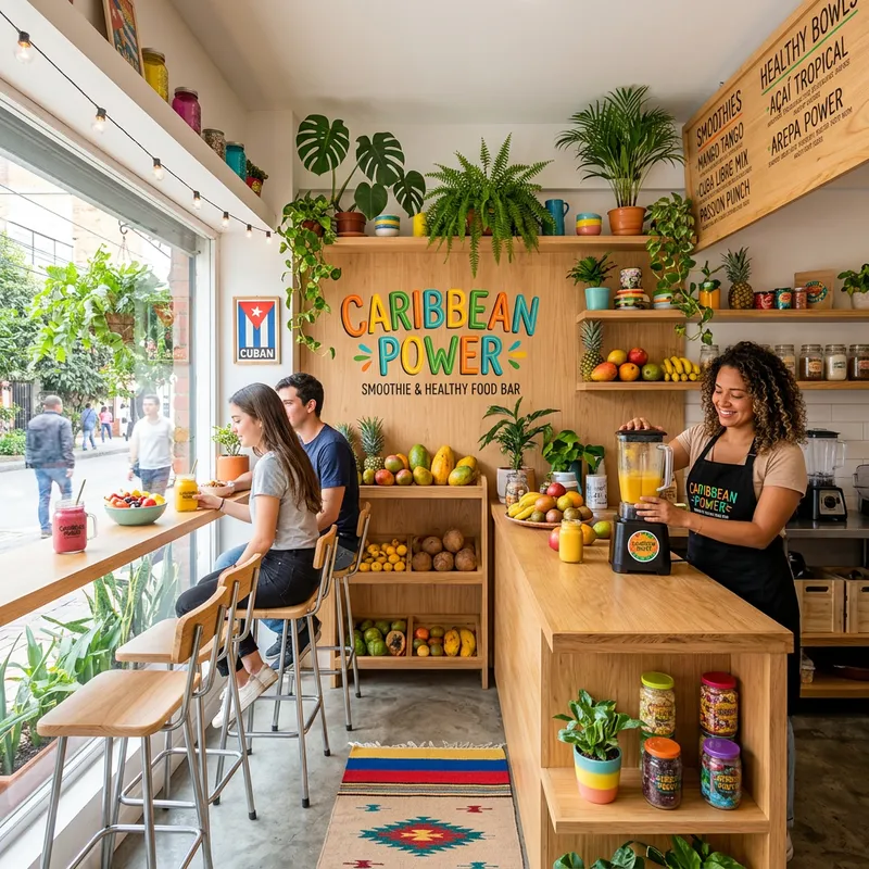 Local of 17 square meters for a business called Caribbean Power, which is a smoothie and healthy food bar inspired by Colombian and Cuban fruits, featuring a minimalist design with natural wood tones and colorful touches with plants and fruits.