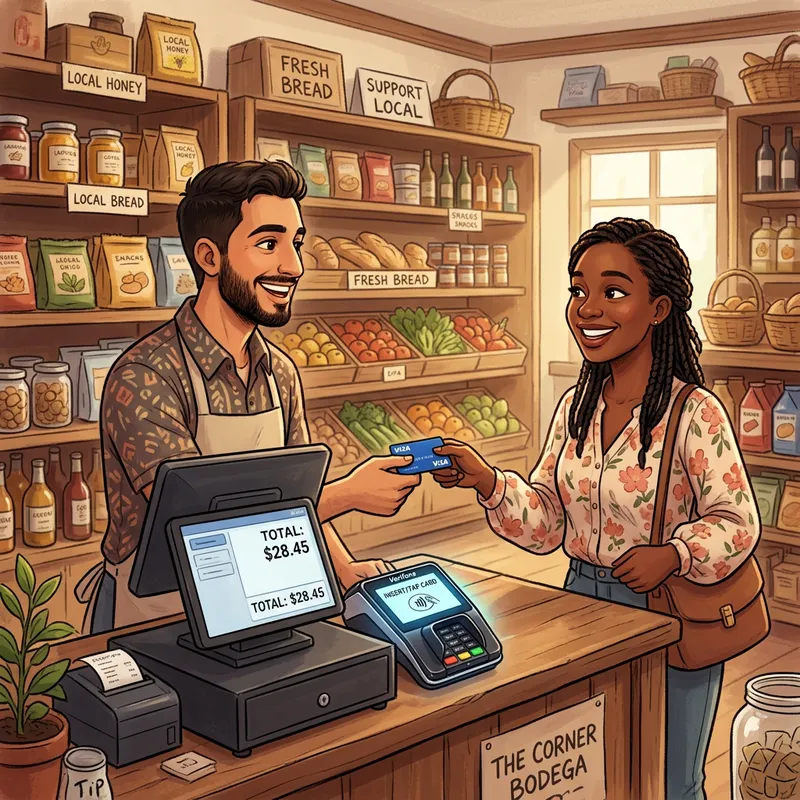 Illustration of a customer interaction at a small local store. A young Middle-Eastern male storekeeper smiling as he accepts payment in the form of a card from a Black female customer. She is handing him her card with a satisfied expression. The backdrop has items of a local store, visible on wooden shelves. The cash register is clearly visible, showing the digital total amount on the screen. You can see the gleaming card payment machine next to it. There's a sense of calm, positivity, and satisfaction reflecting in the scenario.