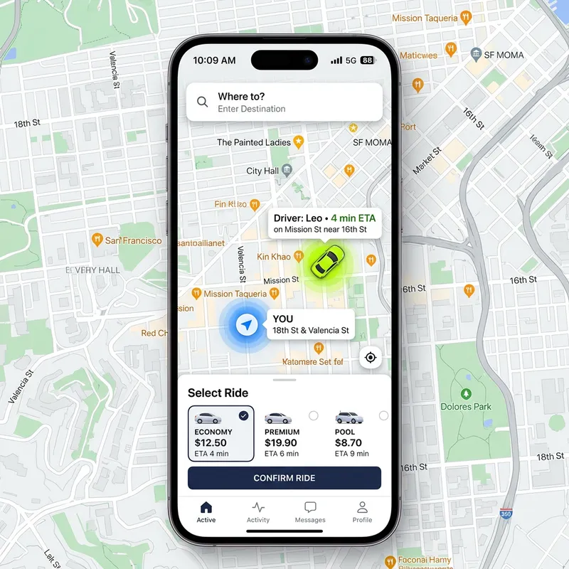 Generate an image of a location map UI design. This user interface should be for a ride sharing application. It should indicate various points of interest, such as restaurants and landmarks. Importantly, it should also highlight the current location of a diver, possibly with a unique symbol or color. Ensure the design is clean and intuitive, with clearly readable labels. The overall aesthetic should be modern, reflecting cutting-edge technology and user-friendly design principles.