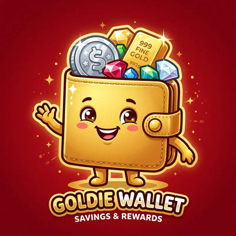 LOGO cute gold wallet mascot silver coin & gold bar & colorful gem on head red background.