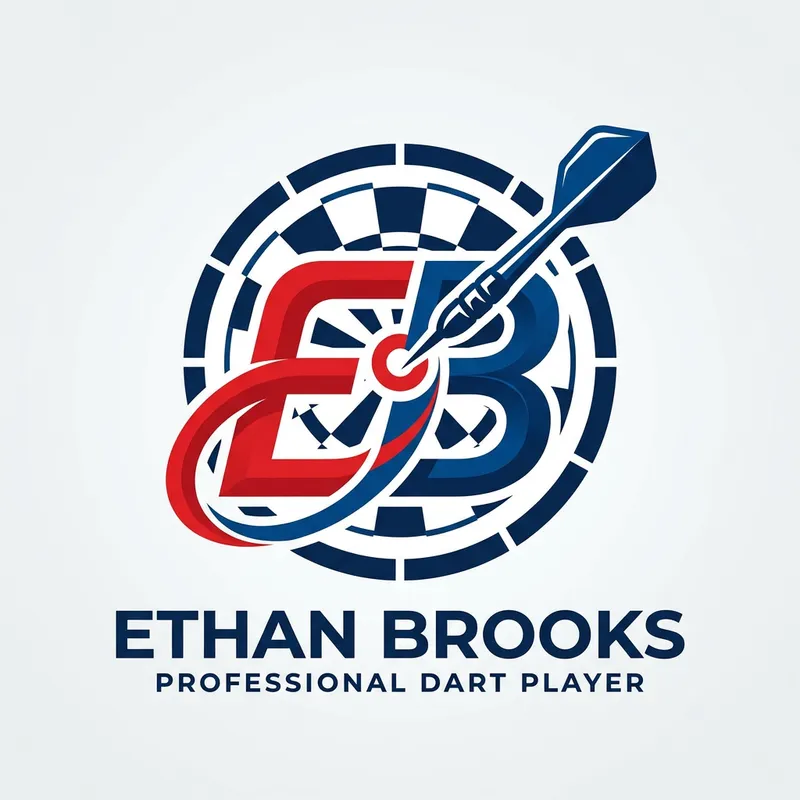 Create an abstract and lively logo for a professional dart player. The design should prominently incorporate the letters 'E' and 'B' intertwined. To illustrate the dart player aspect, implement imagery of sleek and aerodynamic darts or dartboard elements. The color scheme should evoke competitive spirit, perhaps utilizing bold reds, rich blues, and crisp whites. The style should be modern and clean, with an artistic balance of simplicity and complexity to capture attention.