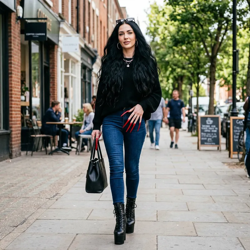 longest red 12 inch fingernails with very super long black hair covering breasts beautiful white skin face slutty highest platform highheels.