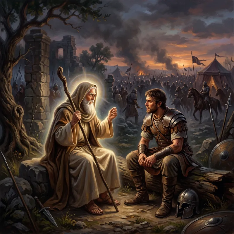 Illustrate an entrancing image that captures a sacred moment on an ancient battlefield. Two mystical figures, one radiating wisdom and compassion, are immersed in a profound discussion. The figure emitting a wisdom glow is seemingly providing spiritual counsel to the other, who listens with deep reverence, enlightenment, and steadfast determination on his face. Design the scene to emphasize the contrast between the divine wisdom emanating from the spiritual figure amidst the tumult of warfare, thus evoking feelings of transcendence and spiritual awakening. Strive to capture the ageless wisdom of ancient scriptures through appropriate lighting and composition.
