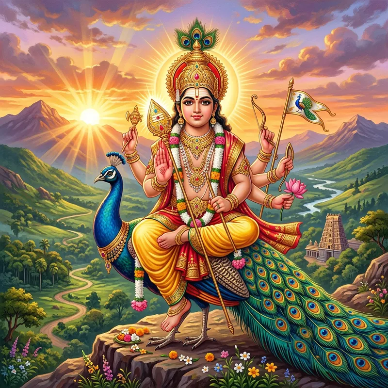 A detailed depiction of Lord Murugan, one of the divine figures in Hindu mythology. He's presented in a stylized traditional manner, with a golden aura around him signifying his divine nature. He's adorned in lavish gold and red attire, seated peacock, his vahana, and equipped with his divine weapon, the Vel. Similar to classical Hindu illustrations, have him with multiple arms, each carrying a different symbolic item linked to his mythological narratives. The backdrop should be a serene landscape of a hilly region, with bright rays of sun setting behind.