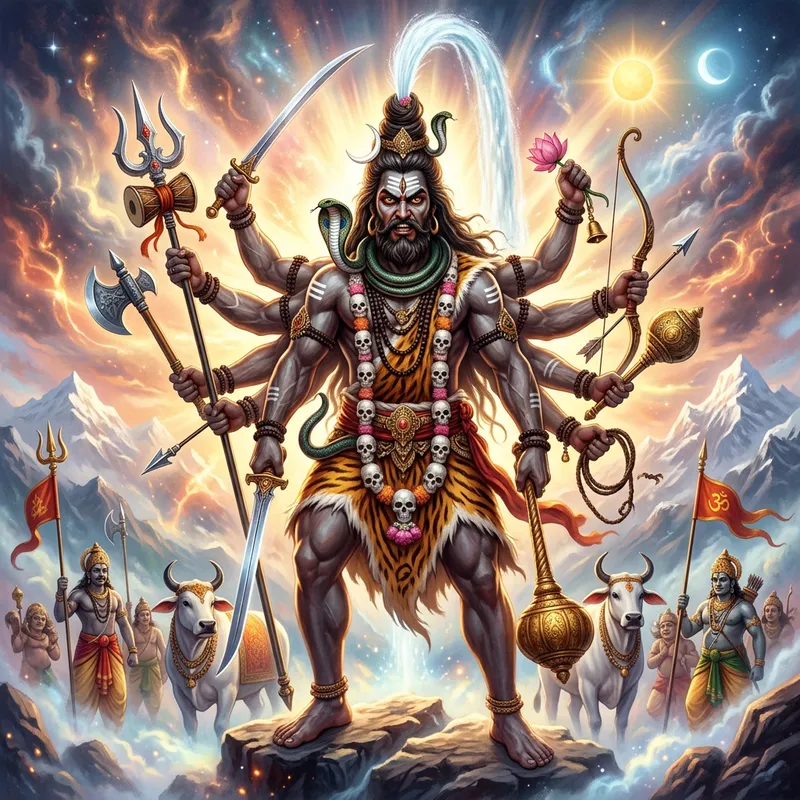 An image of Lord Rudra from Hindu mythology, shown in his most powerful and divine form. He is depicted as a fierce deity, with numerous arms holding different weapons and symbols. His fierce eyes glare from his face, which is marked with symbolic lines. He is adorned with a traditional attire of the ancient times, and his long hair is tied up in a top knot from which the holy River Ganges is believed to flow. The backdrop emanates divine light, enhancing his formidable yet divine persona.