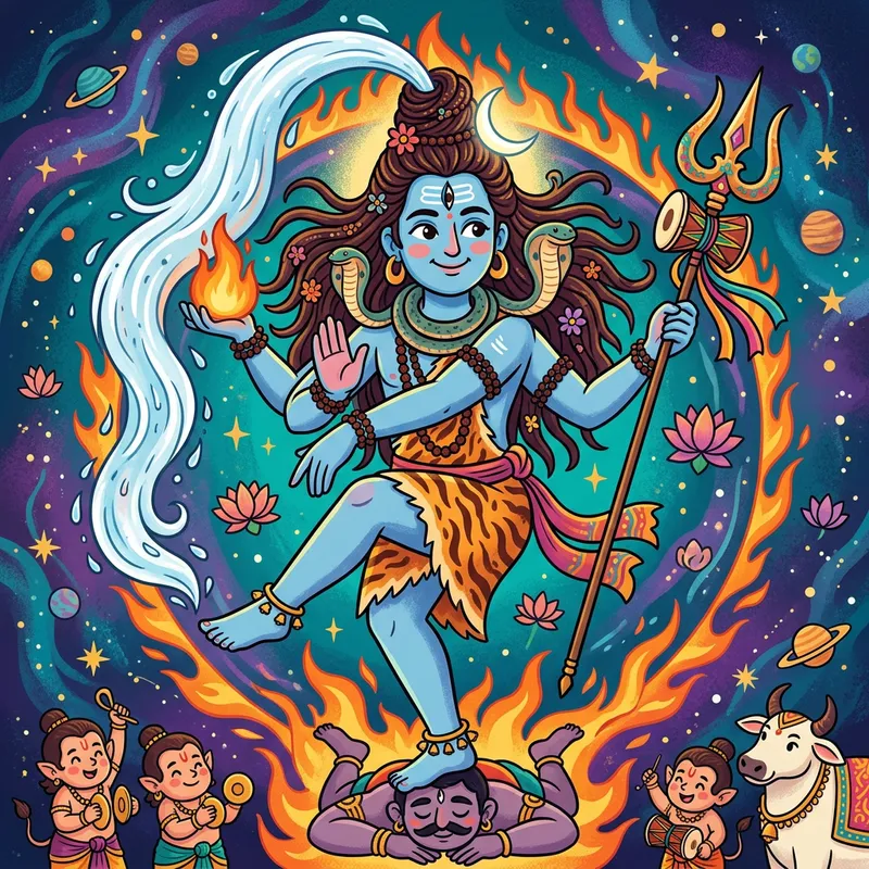 Vibrantly colored, playful illustrations of Lord Shiva, an important deity in Hindu mythology. Depict Shiva with his traditional attributes: the trident, the drum, the crescent moon adorning his hair. Please include sacred elements such as the Ganga River flowing from his hair, and the third eye on his forehead. Encapsulate the essence of his divine energy and cosmic dance.