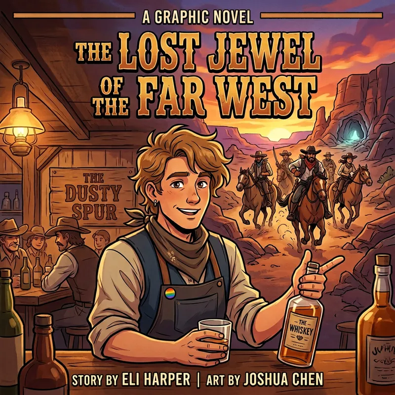 Visualize a cover for an animated graphic novel about cowboys in the desert, titled 'The Lost Jewel of the Far West'. The main character is a light brown-haired, 19-year-old gay bartender. He is the one who narrates the adventures of the rest of the cast, creating the atmosphere as though we are seated in the bar with him.