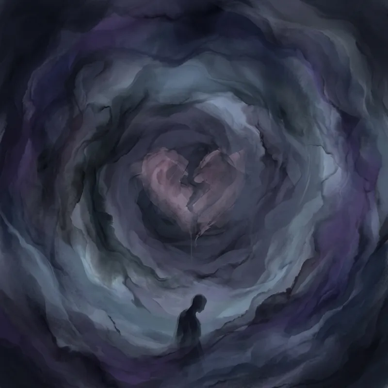 An abstract representation of a soul's depths where love once resided now lost. Imagine deep and brooding colors, perhaps purples and blues, swirling together to create an ethereal landscape. At the center, there should be a symbol of love, now appearing faded or distorted, indicating it's no longer as vibrant or present as it once was. The overall landscape should convey a sense of melancholy, solitude, and longing.