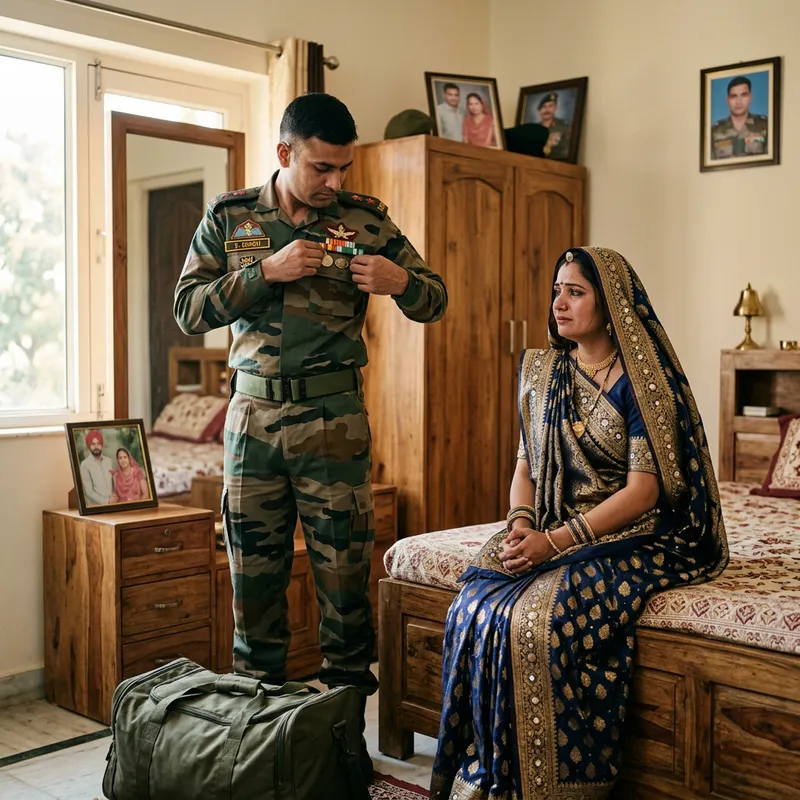A South Asian woman, adorned in an elegant Rajasthani odni, is holding back her emotions. Her husband, a determined man of the same descent, is getting dressed in his military uniform, signifying a poignant moment before his departure. He is adjusting the badges on his uniform, preparing for duty. The atmosphere is sincere and heavy with the understanding of duty and separation, embodied in the couple's expressions and postures. The room is filled with soft light from a nearby window, subtly highlighting their garments and adding depth to this intimate scene.