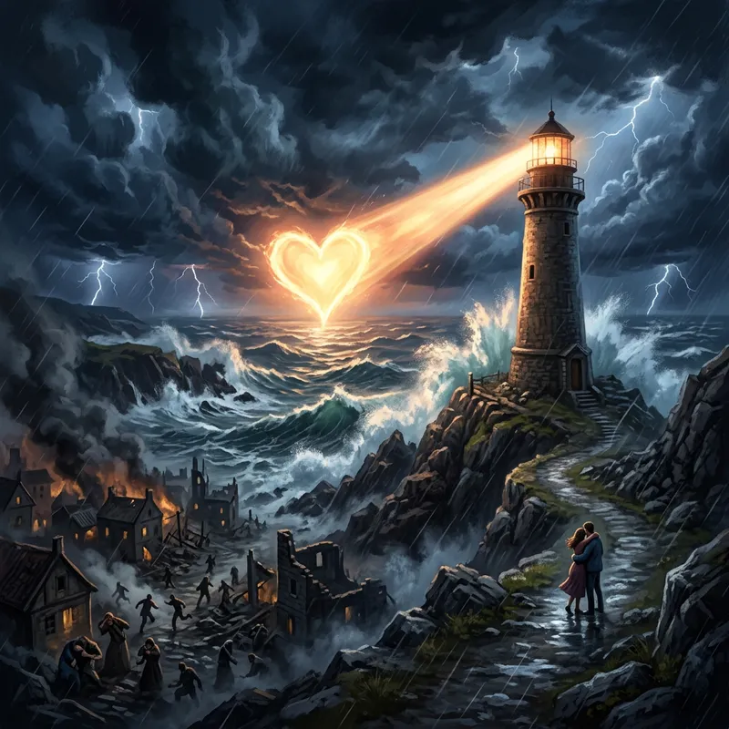 Please create an illustration that represents the theme of the song 'Love In The Chaos'. The concept is a world teeming with dramatic events representing unrest and unpredictability. Despite the overwhelming turmoil, love persists as a symbol of hope and steadiness. Perhaps this could be symbolized with a turbulent sea or a stormy sky, but amidst it all, stands a lighthouse radiating a heart-shaped light, symbolizing love standing strong amidst the chaos.